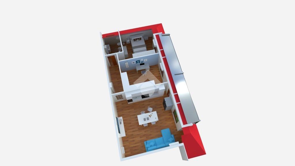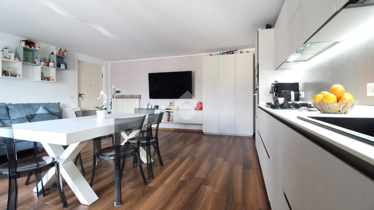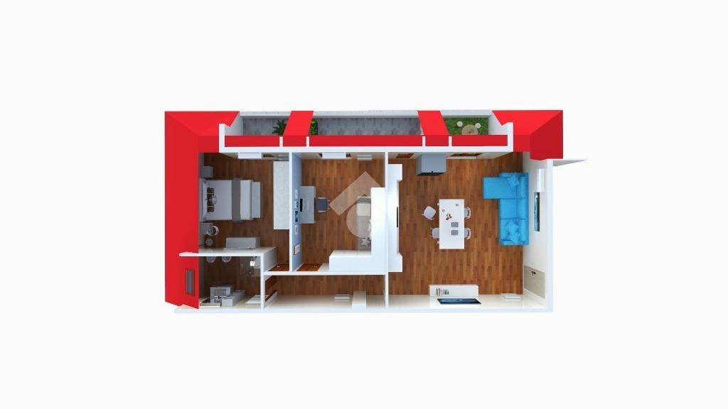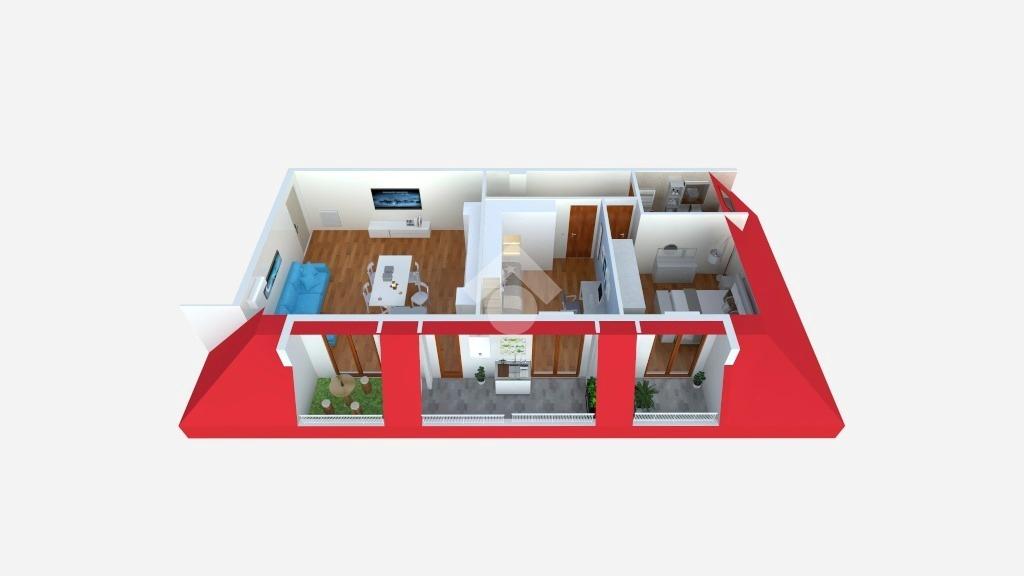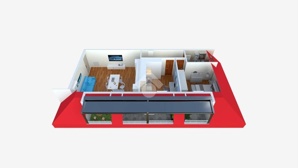 L’immobile è composto da un luminoso soggiorno con cucina a vista, una camera matrimoniale, una camera doppia e un bagno finestrato, ed è arricchito dalla presenza di tre balconi a tasca, tutti esposti ad ovest e attrezzati con pergotenda di copertura.