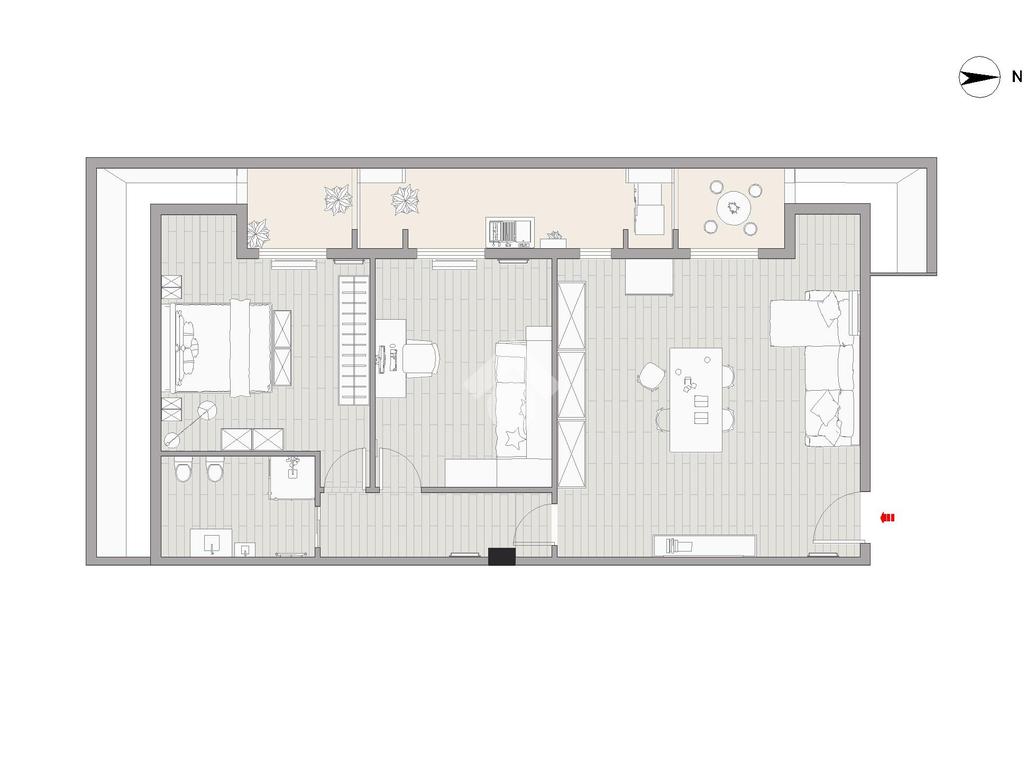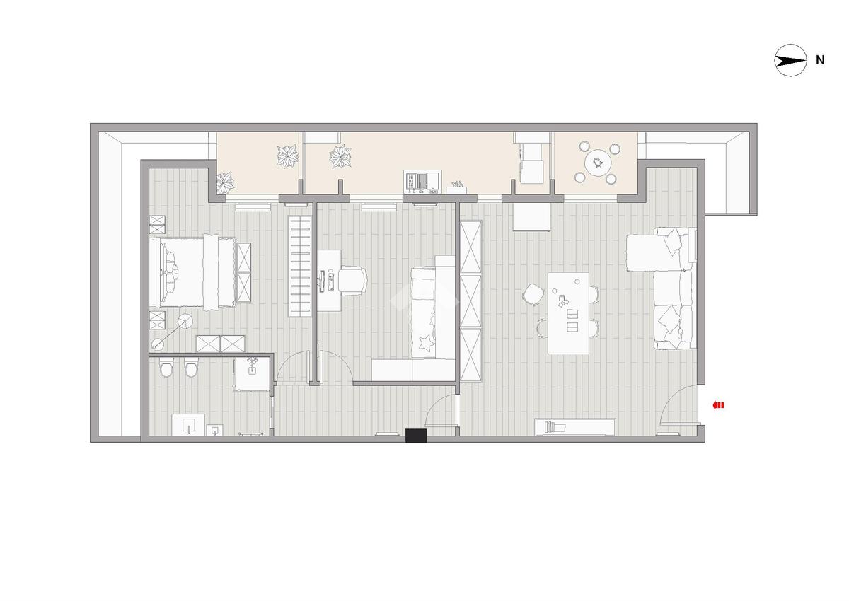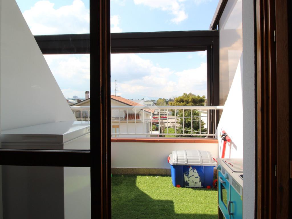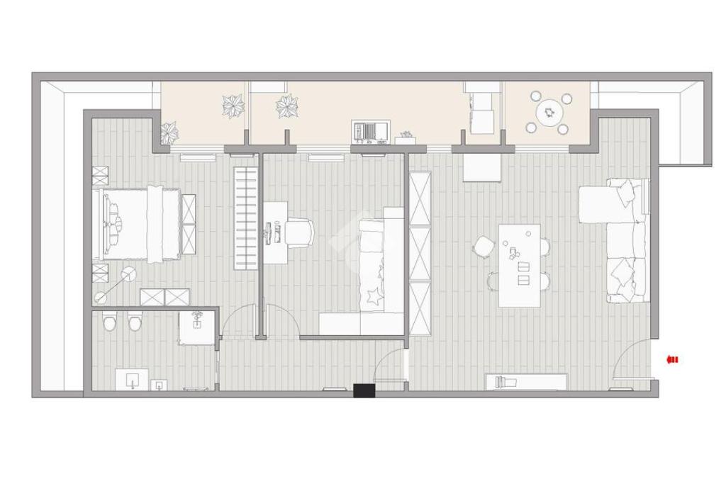 L’immobile è composto da un luminoso soggiorno con cucina a vista, una camera matrimoniale, una camera doppia e un bagno finestrato, ed è arricchito dalla presenza di tre balconi a tasca, tutti esposti ad ovest e attrezzati con pergotenda di copertura.